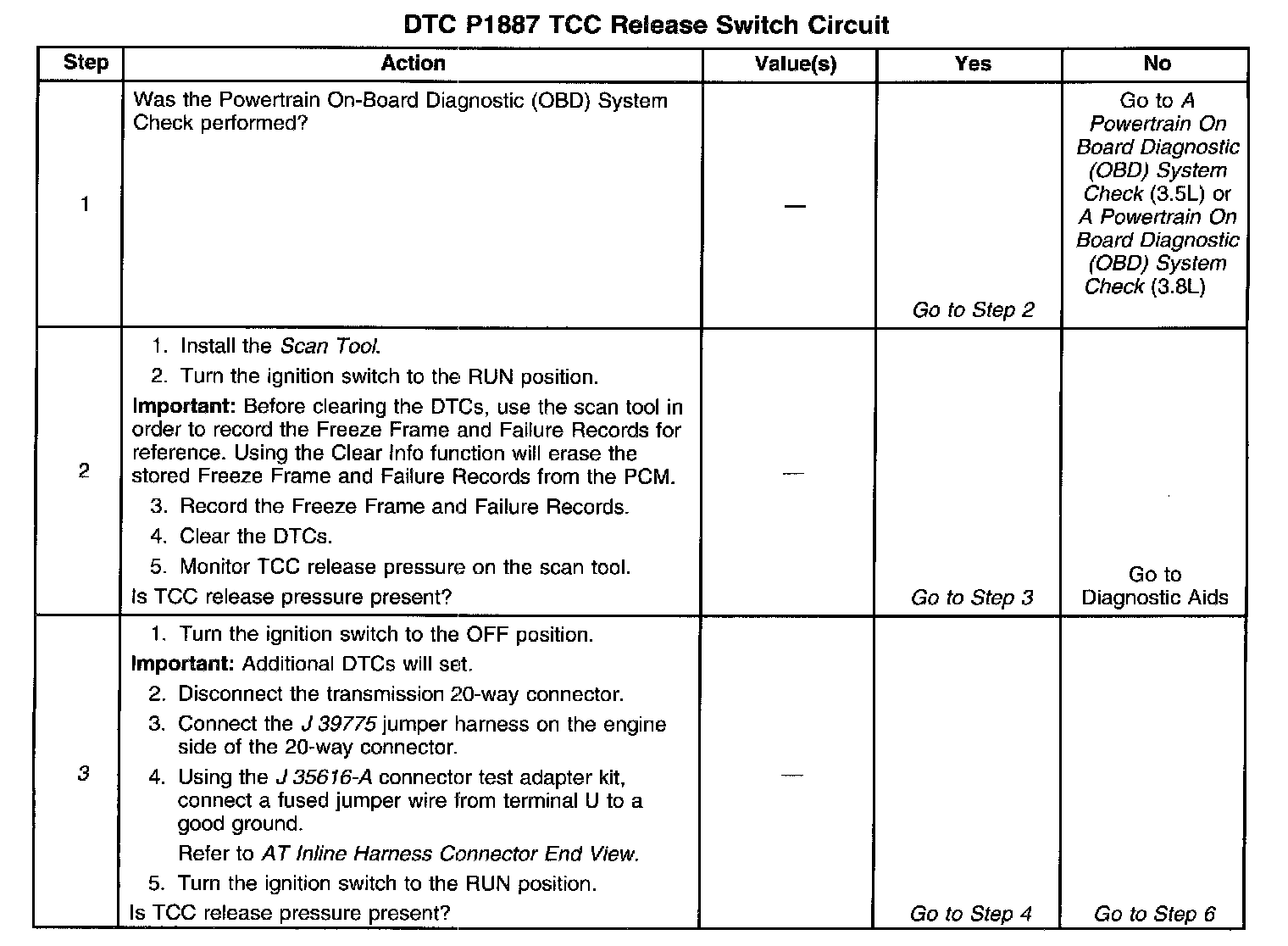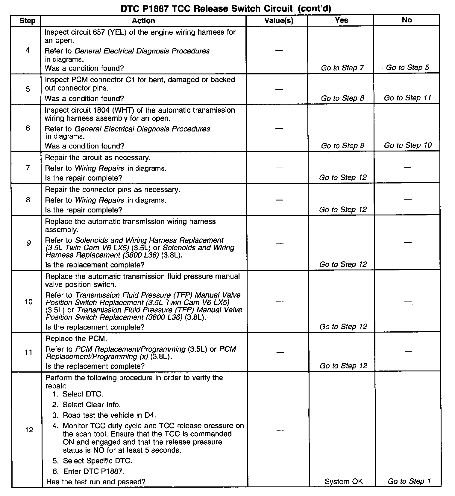 If the PCM determines that the TCC release switch is open (indicating that the TCC is not applied) and the TCC slip speed indicates that the TCC is applied, then DTC P1887 sets. DTC P1887 is a type B DTC.