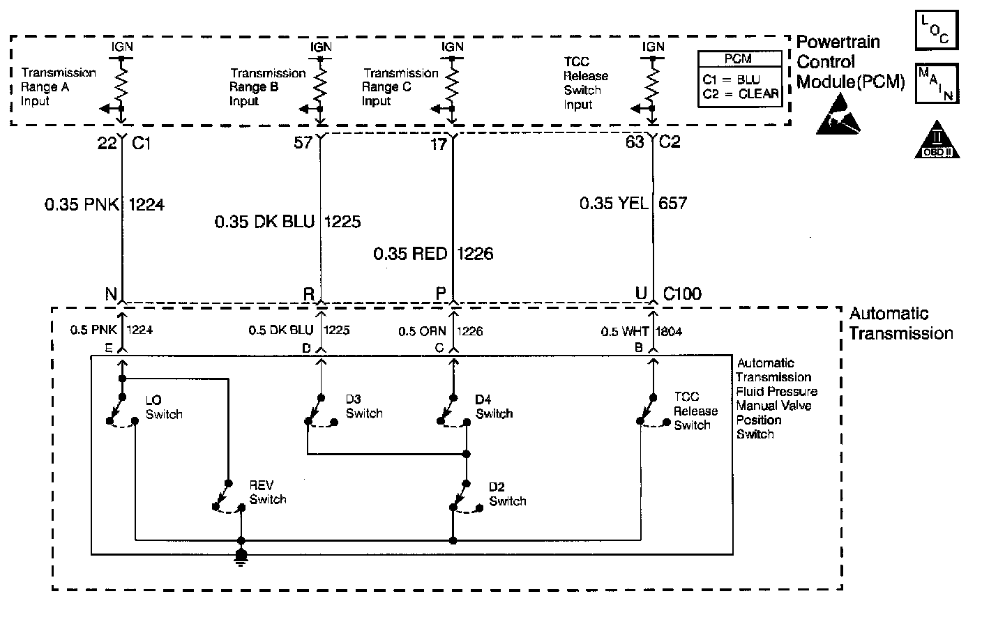The switch signals the PCM that the TCC is released. This is accomplished by torque converter release fluid pressure acting on the switch contact which opens circuit 657/1804. When the voltage is high on the circuit, the PCM recognizes that the TCC is no longer engaged.