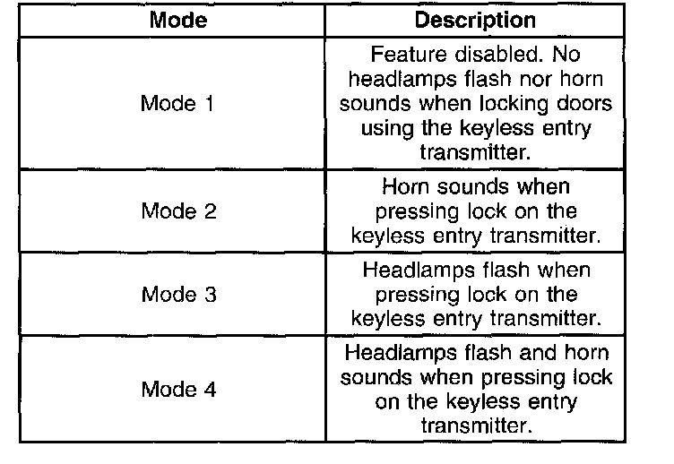 5. To advance the mode: Press and release lock again on the keyless entry transmitter.