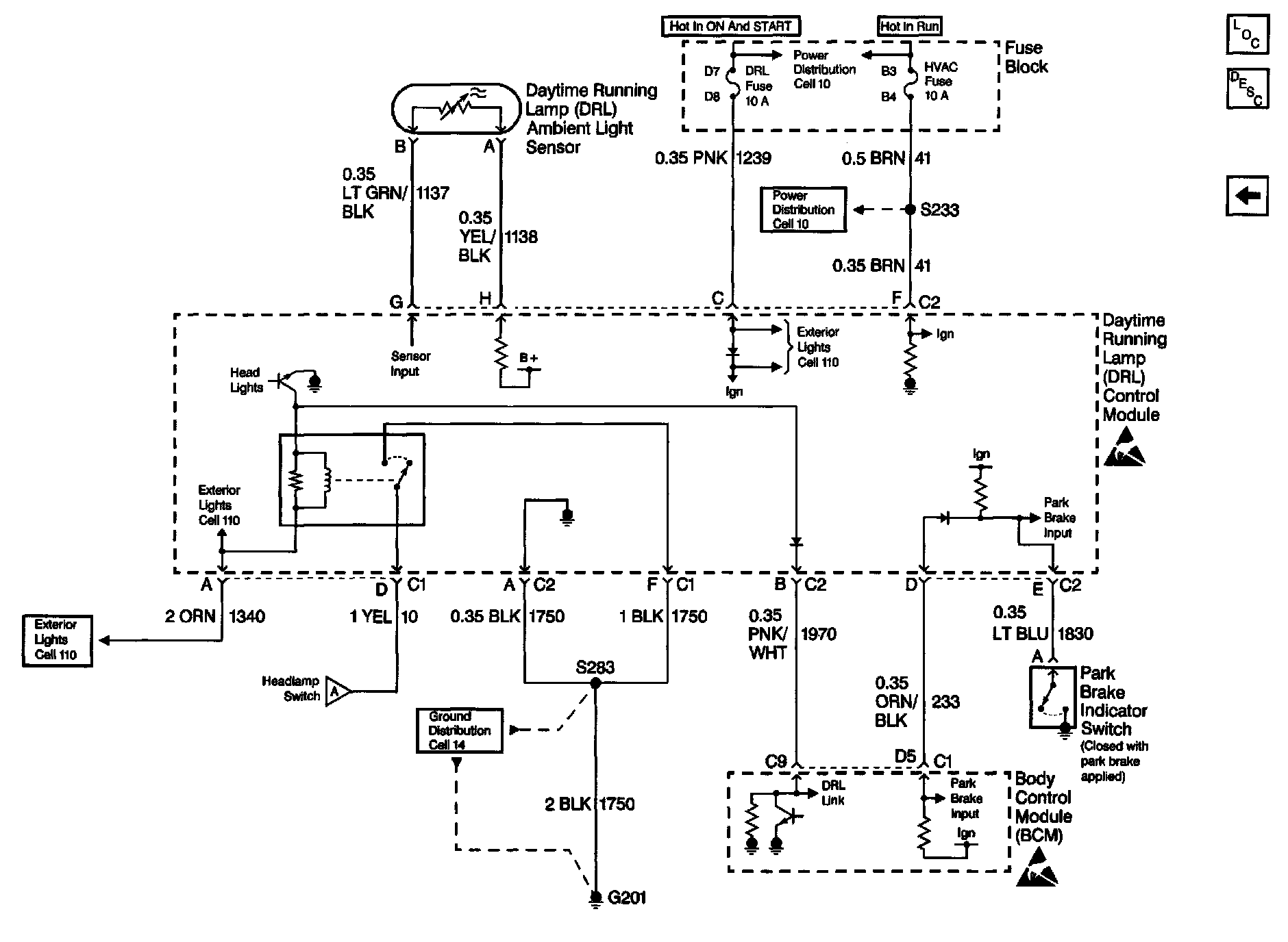 Headlights Schematics: Power, DRL Control Module, BCM, Park Brake Indicator Switch: