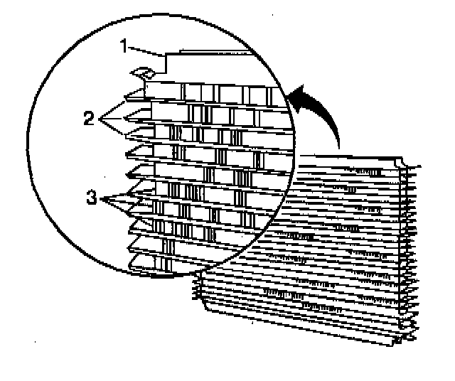 These models have an aluminum, cross-flow design core (1). The core uses a stack of horizontal tubes (2) that resist plugging. The cooling fins (3) surround these tubes. The top and bottom ribs strengthen the assembly. The saw-cut in each strengthening rib allows for expansion during temperature changes.