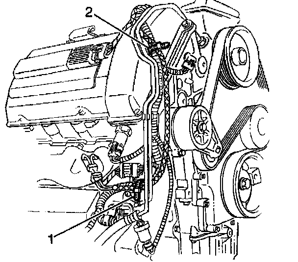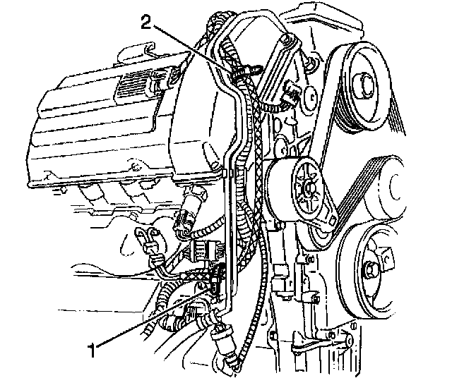 4. Install a new upper right (rear) coolant heater cord strap (2) at the engine wiring harness by the power steering lines.