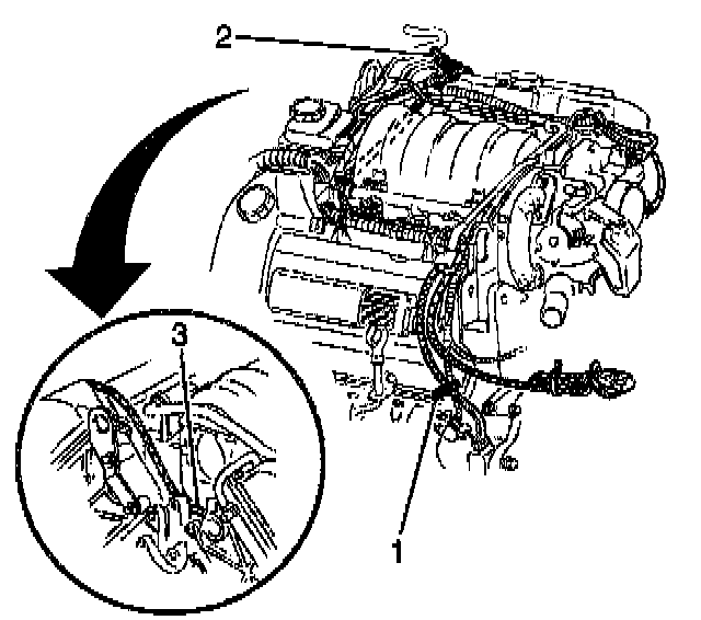 4. Remove the right (rear) coolant heater cord from behind the power steering pump (3).
