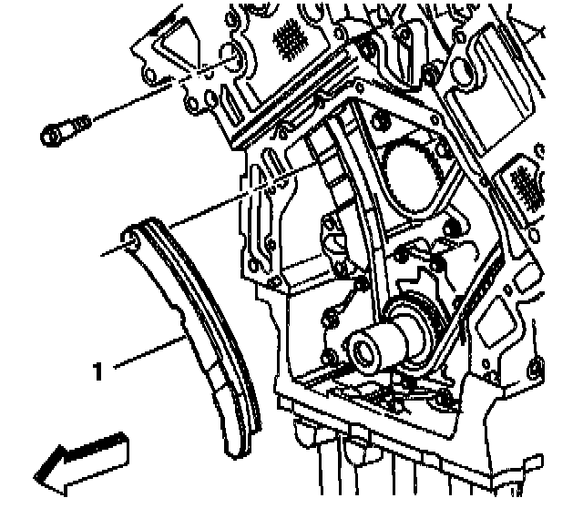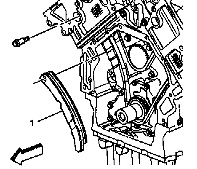 15. Remove the primary timing chain tensioner shoe (1) by pushing the guide downward slightly and then pulling it up through the cylinder head.
