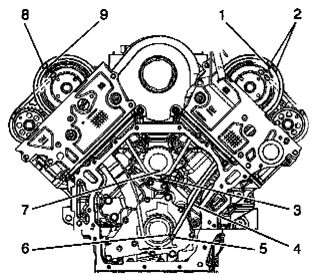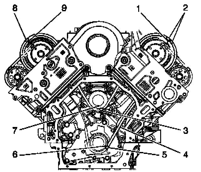 8. Wrap the timing chain around the right intake camshaft sprocket and align the marked I inked (8) with the sprocket's timing mark (9).