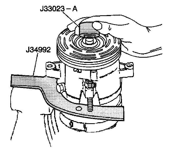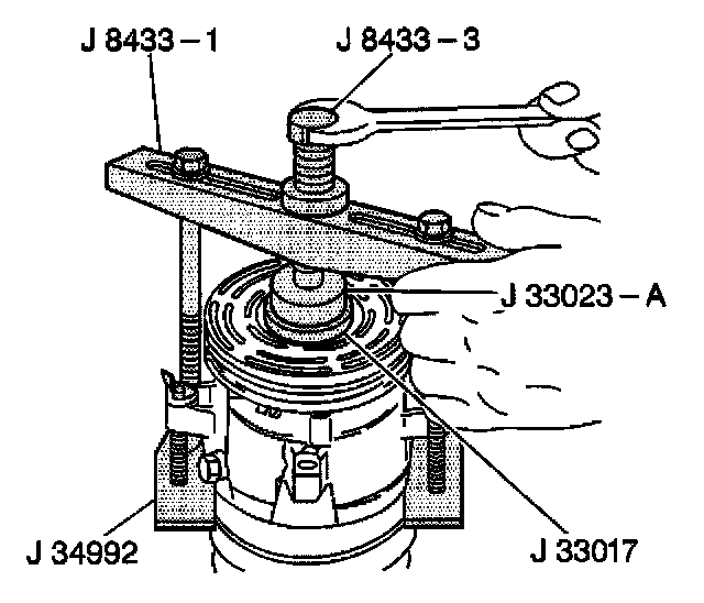 15. Tighten the J 8433-3 in the J 8433-1 in order to force the pulley rotor and bearing assembly onto the front head of the compressor.