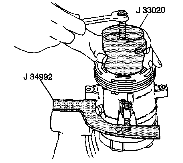 6. Hold the J 33020 in place. Tighten the puller screw against the puller guide in order to remove the puller rotor and bearing assembly.