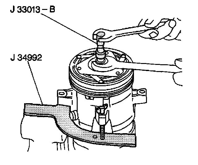 8. Back oft the body of the J 33013-B in order to allow the center screw to be threaded onto the end of the compressor shaft.