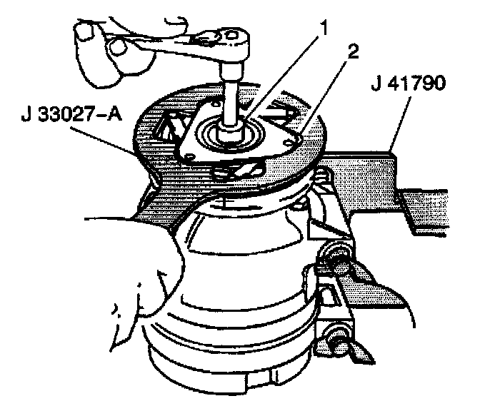 11. Hold the clutch plate and hub assembly (2) with the J 33027-A.