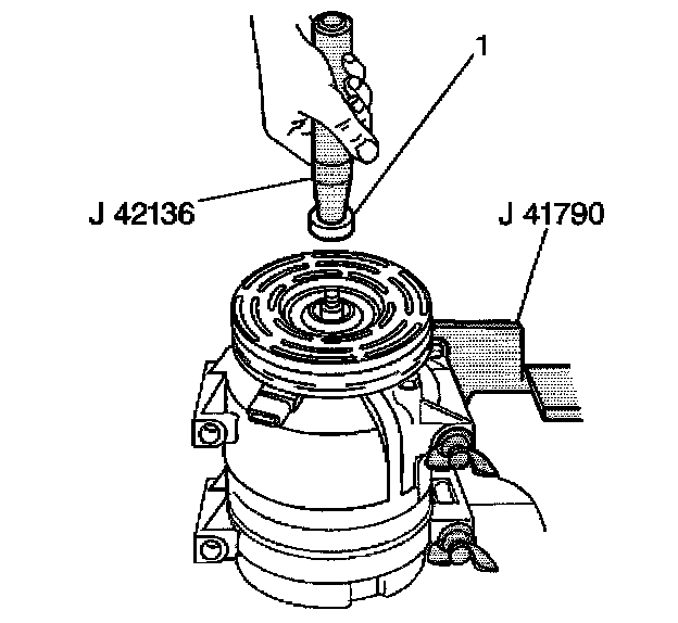 1. Dip the new compressor shaft seal (1) in clean 525 Viscosity refrigerant oil and assemble the seal onto the J 42136, by turning the handle clockwise.