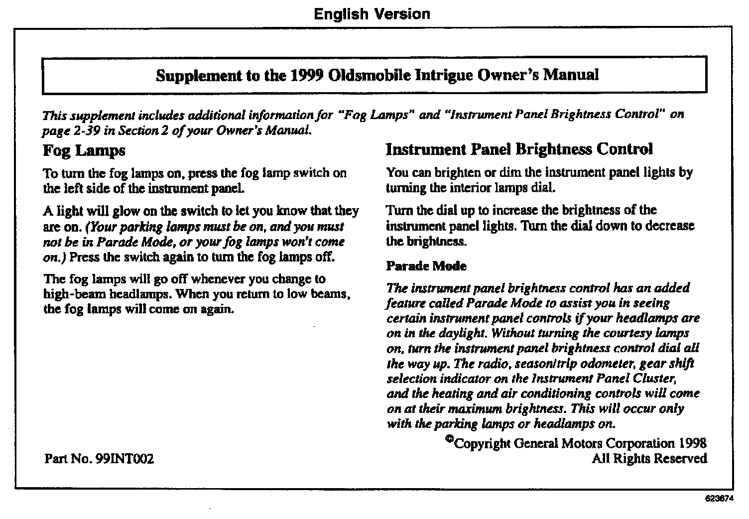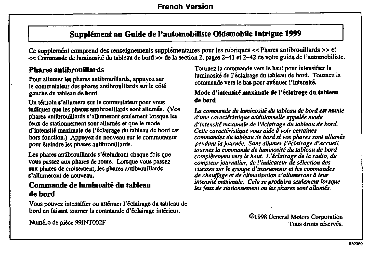 There is some confusion between the Owner's Manual, P/N 22600386 A (English) or P/N 52368380 (French) and production vehicles. The vehicle wiring was changed after the start of production for the 1999 model year and Campaign 98069 was issued to change the wiring in early 1999 Oldsmobile Intrigue vehicles. The second edition of the Owner's Manual, P/N 22600386 B - (English) was revised to reflect this change. The part number can be found on page ii of the Manual.