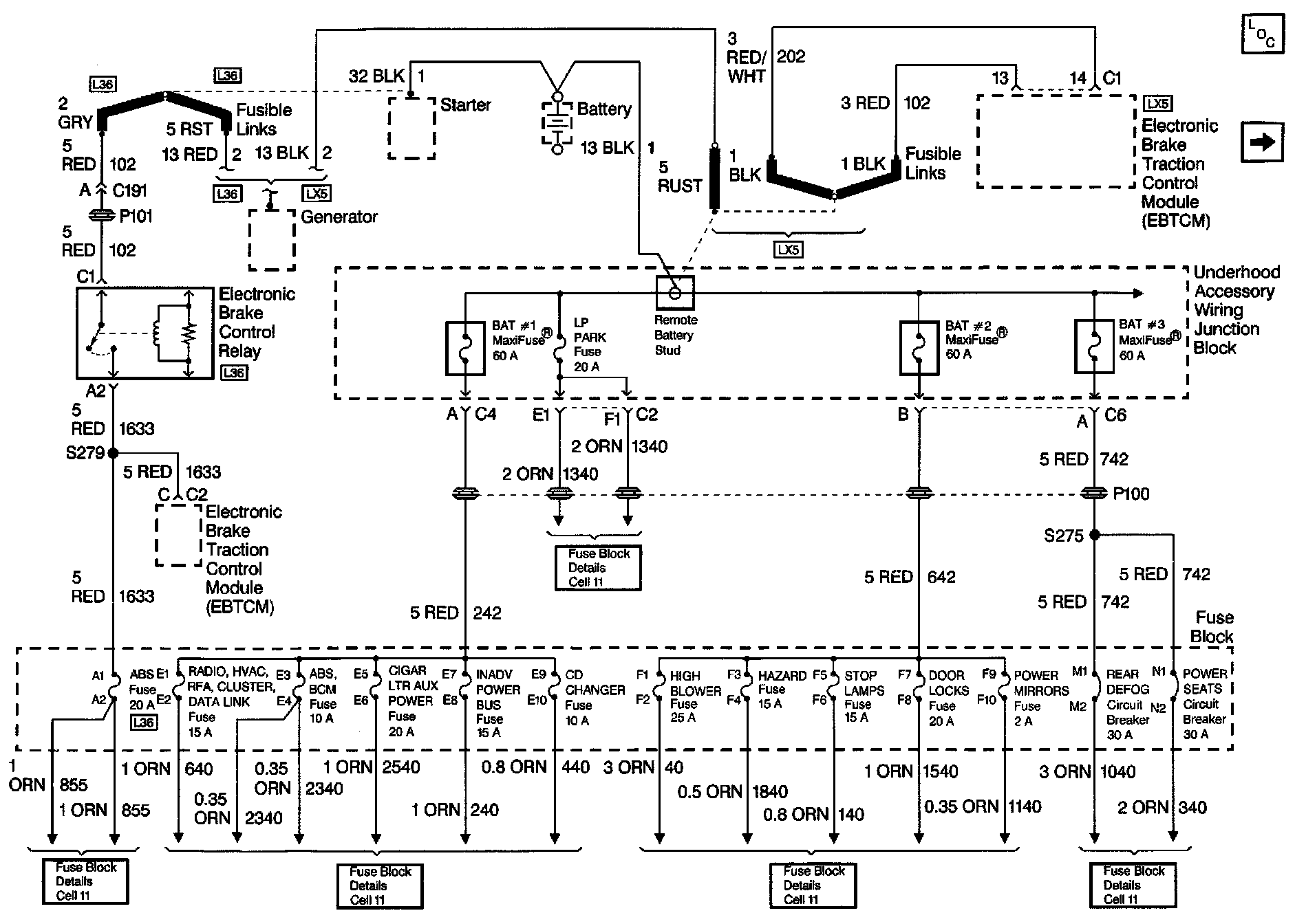 Power Distribution Schematics: Battery, Generator, EBTCM, And Underhood Accessory Wiring Junction Block: