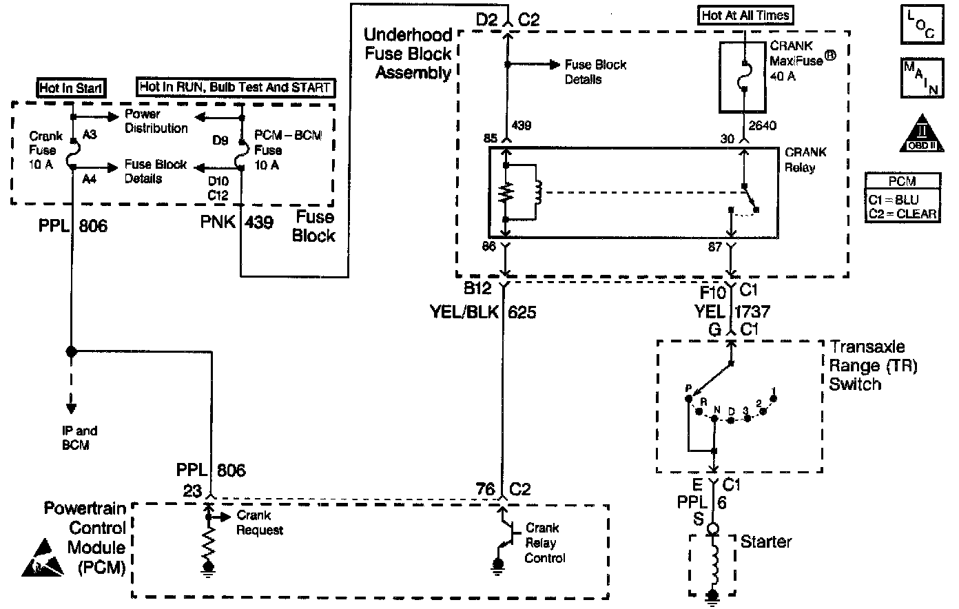 If no inhibiting conditions are present, and the PCM detects voltage on the Crank Request circuit, the PCM grounds the Crank Relay Control circuit. Current from the Crank Maxifuse flows through the relay through the Transaxle Range switch (only in P/N) to the Starter solenoid.