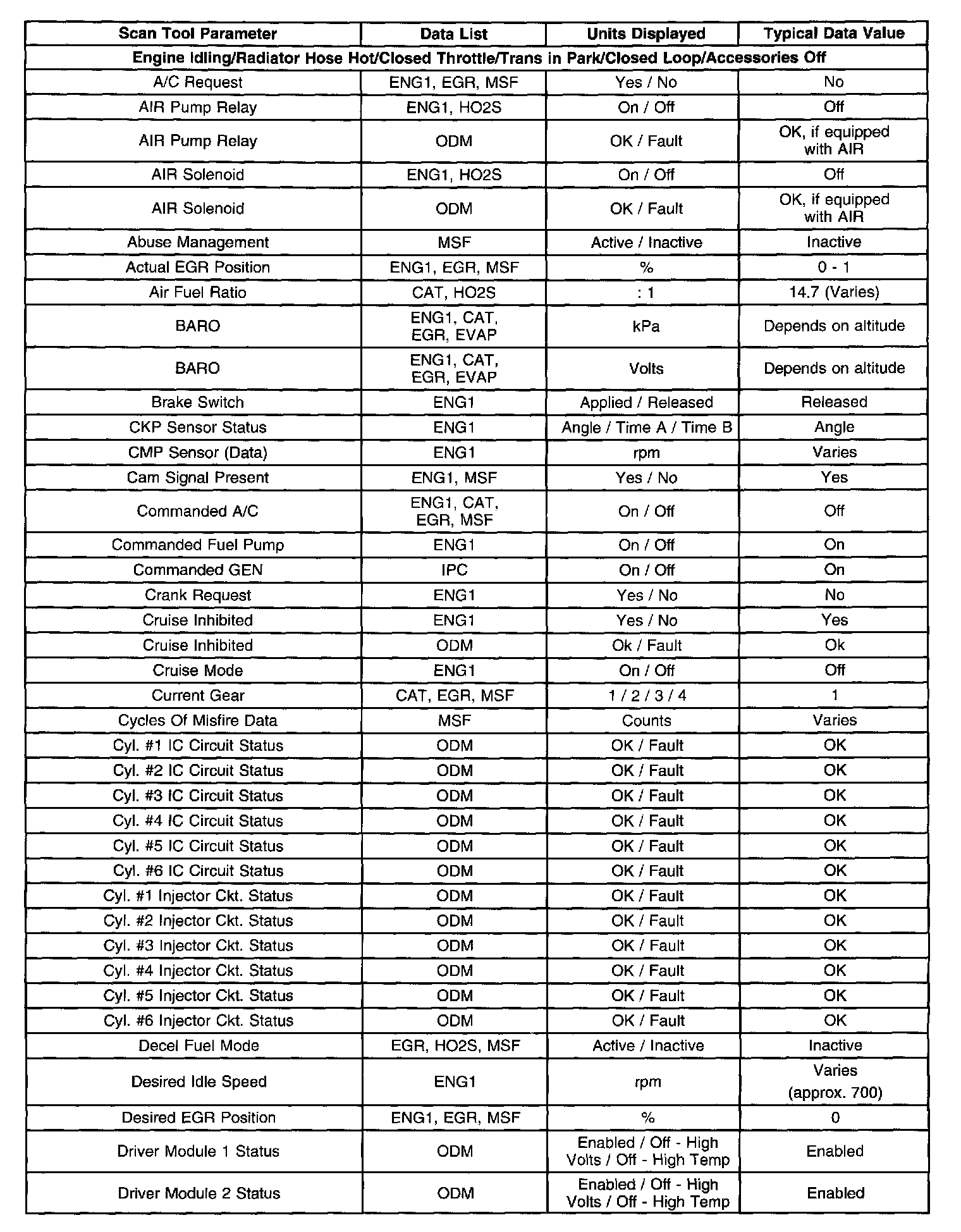 The Engine Scan Tool Data List contains all engine related parameters that are available on the scan tool. The list is arranged in alphabetical order. A given parameter may appear in any one of the data lists, and in some cases may appear more than once, or in more than one data list in order to group certain related parameters together.