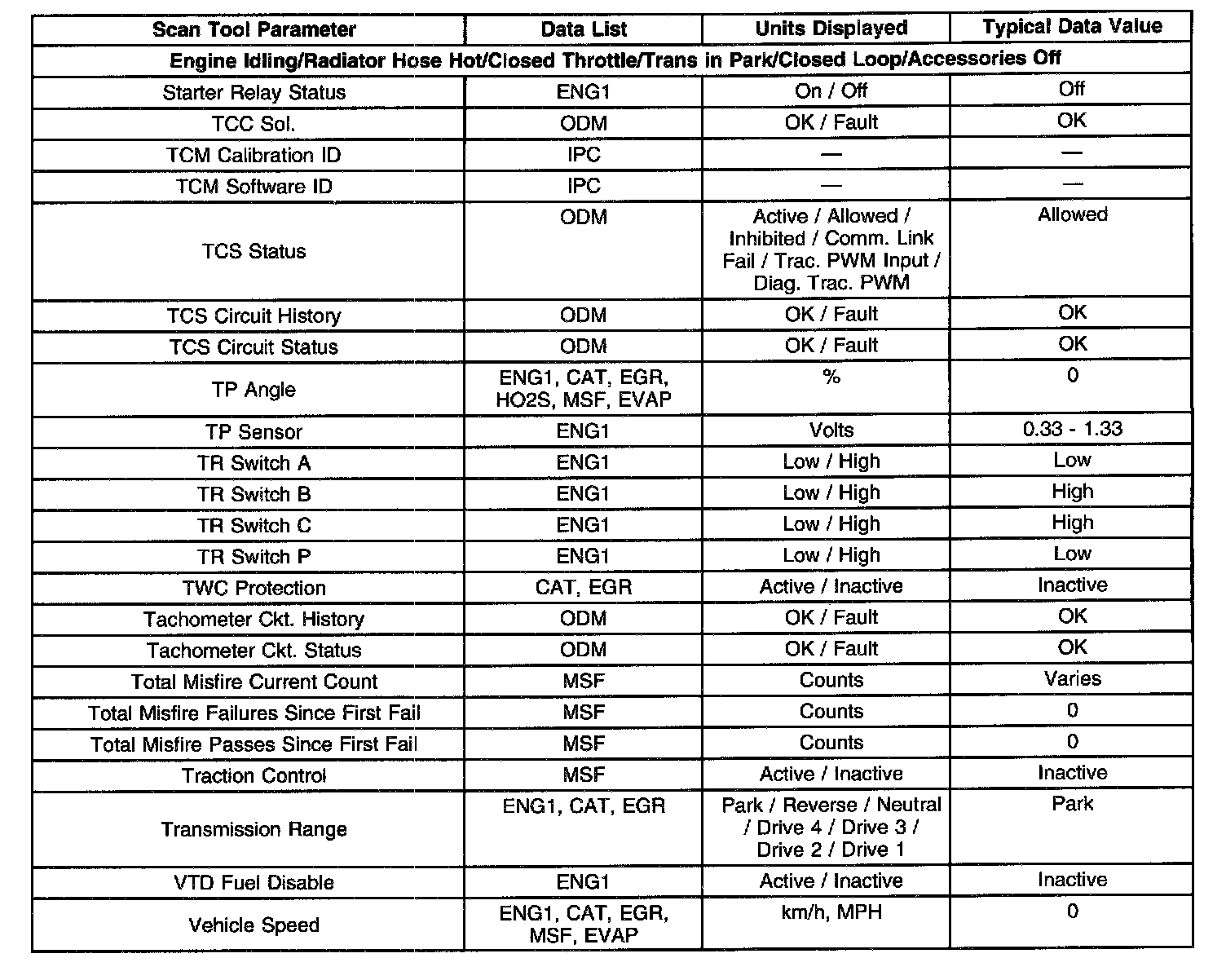 Only the parameters listed below are referenced in this service manual for use in diagnosis. Refer to Symptoms for diagnosis if all values fall within the typical range described in the table.