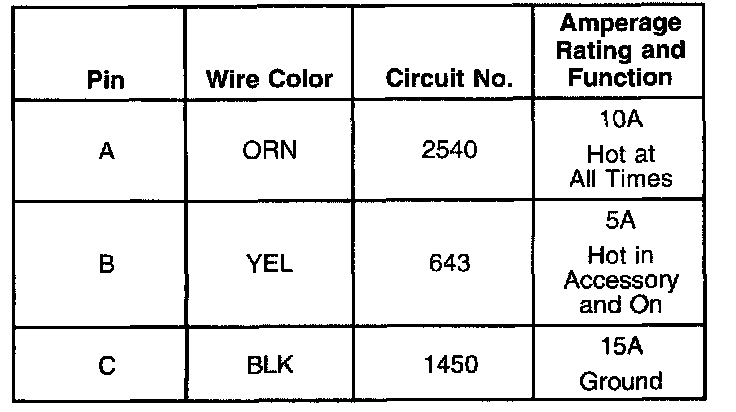 Voltage is applied through the CIGAR LTR fuse at all times to the cigar lighter, accessory power receptacle and the power drop connector through circuit 2540. The cigar lighter has a heating element that, when pushed in, completes the circuit to ground through circuit 1450, and begins to heat up. When the element is sufficiently heated, the cigar lighter opens the circuit. The accessory power receptacle will accept the accessory plug when pushed in and allow the circuit to ground through circuit 1450. The circuit will be maintained until the accessory plug is pulled out of the accessory power receptacle. Voltage is also applied to the power drop connector through the POWER DROP fuse when the ignition switch is in accessory or on. The power drop connector can be used for a more permanent connection of an accessory. Ground will also be applied to the accessory through circuit 1450.
