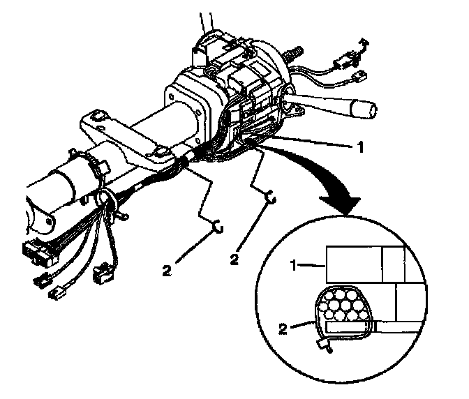 3. Pop the wire harness assembly (1) out of the wire harness strap (2).