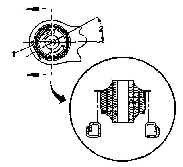 1. Align the flat edge of the bushing flange to the mark in the control arm (1). Ensure that the flat edge of the bushing flange is 30 degrees (2) from the centerline of the lower control arm. Ensure that the thin slot in the bushing is facing outboard.