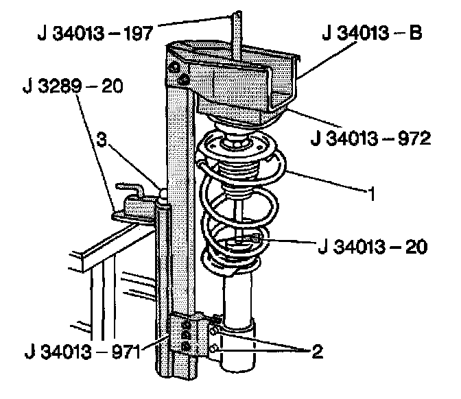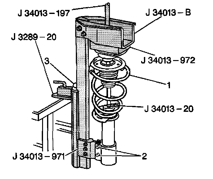 1. Assemble the strut (1) in the J 34013-B using adapters J 34013-971 and J 34013-20 clamped to the strut shaft.