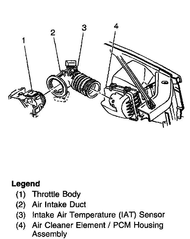 The intake air temperature (IAT) sensor (3) is a thermistor which changes value based on the temperature of air entering the engine. A low air temperature produces a high resistance (100,000 Ohm at -40°C/-40°F), while a high air temperature causes low resistance (70 Ohm at 130°C/266°F). The PCM supplies a 5 volt signal to the sensor through a resistor in the PCM and measures the voltage. The voltage is high when the incoming air is cold, and low when the air is hot. By measuring the voltage, the PCM calculates the incoming air temperature.