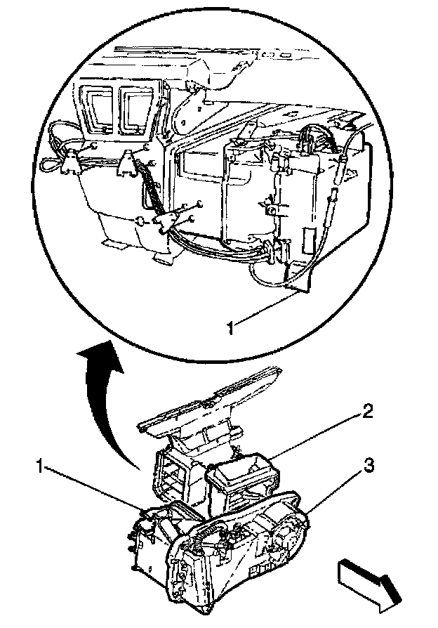 The HVAC blower module (3) is located under the hood beneath the relay center. The HVAC blower module (3) houses the following components: