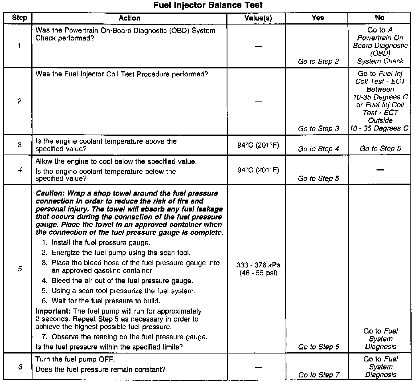 5. The fuel pressure should be within the specified range. If the fuel pressure is not within the specified range, go to Fuel System Diagnosis. Component Tests and General Diagnostics