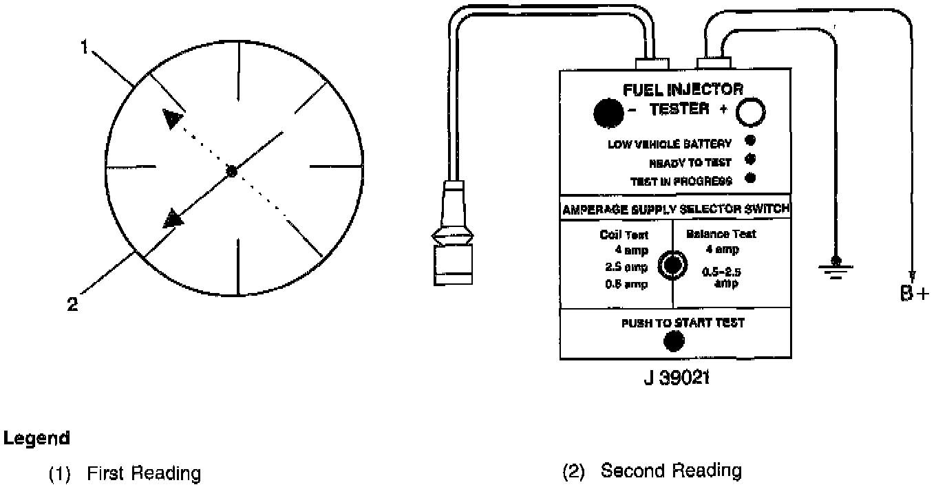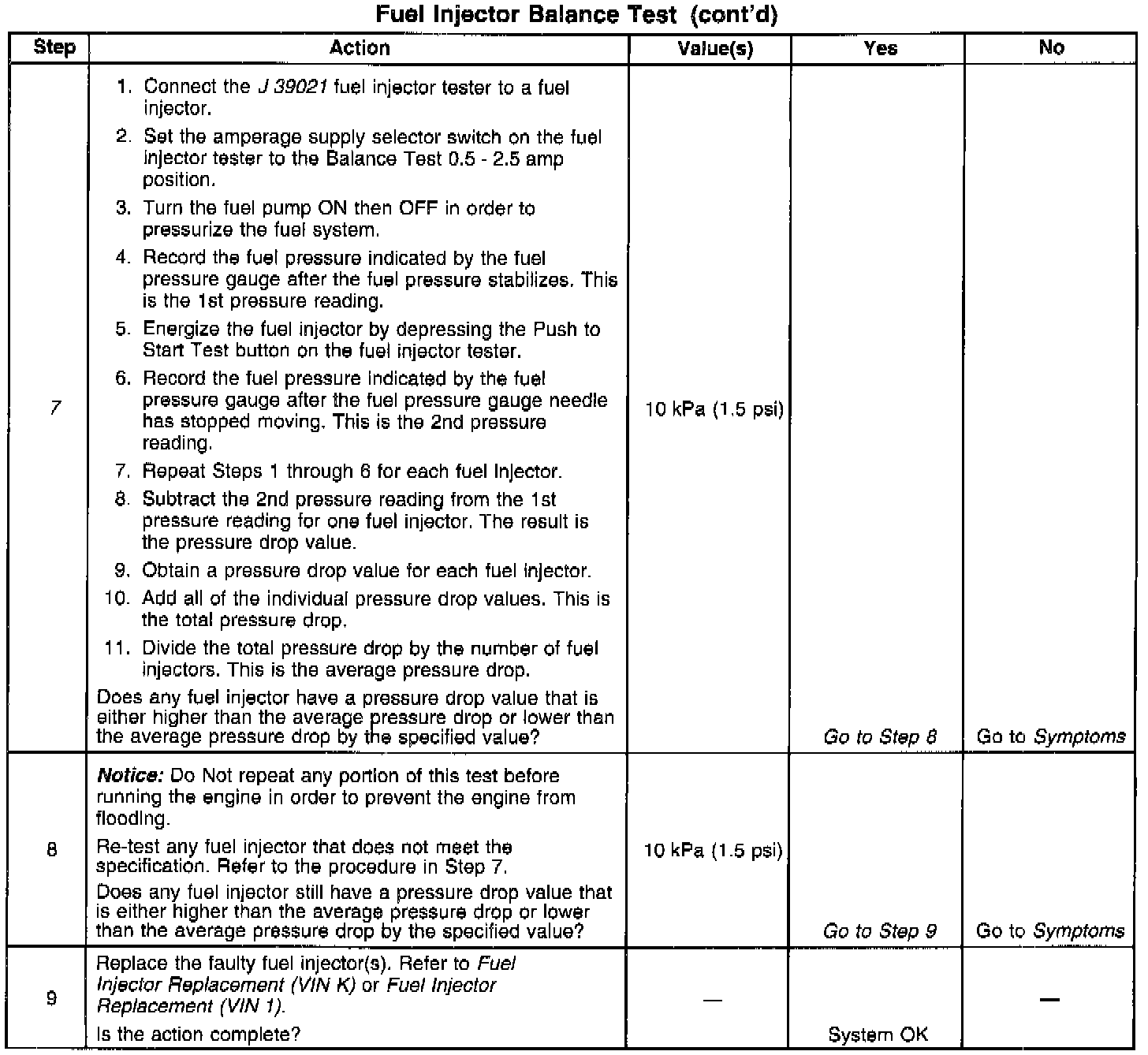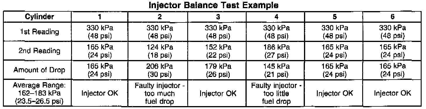 7. If the pressure drop value for each fuel injector is within 10 kPa (1.5 psi) of the average pressure drop value, the fuel injectors are flowing properly. Calculate the pressure drop value for each fuel injector by subtracting the second pressure reading from the first pressure reading. Refer to the Injector Balance Test Example.