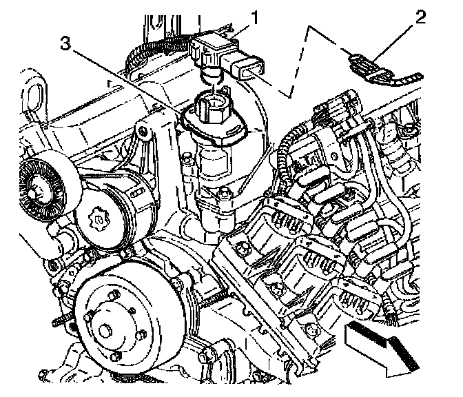 3. Carefully bend the locking tabs holding the MAP (1) sensor to the PCV valve cover (3) just enough to remove the MAP sensor.