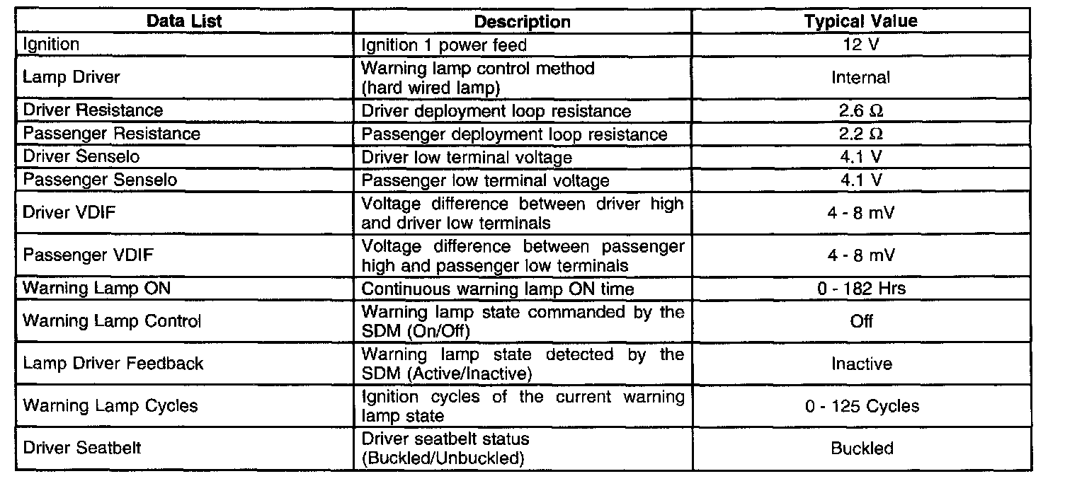 Connect the scan tool to the data link connector (DLC) and turn the ignition switch to the RUN position. The scan tool reads the serial data sent from the Inflatable Restraint Sensing and Diagnostic Module (SDM) serial data output terminal 5 to the DLC terminal g The following table shows the typical values of the data displays under the following conditions: