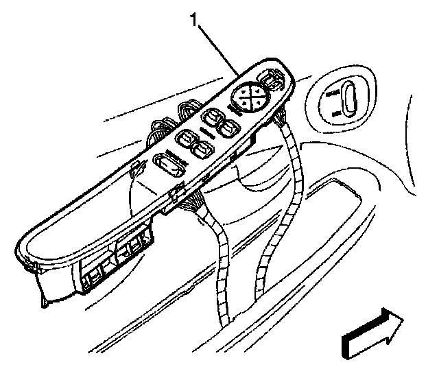4. Use a flat bladed tool in order to pry the front door switch bezel assembly (1) upward. Pry from the rear of the bezel.