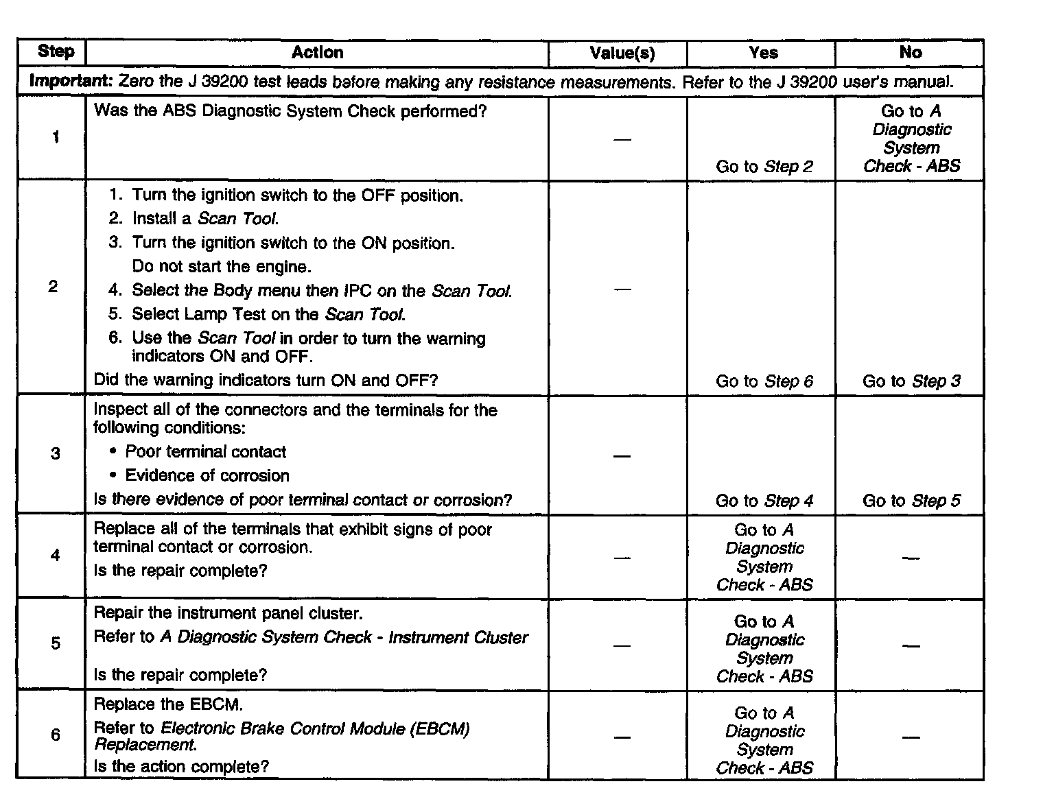 Two-way serial communication is sent back and forth between the EBCM and the IPC. A message from the IPC is sent to the EBCM within seven seconds after ABS initialization. A serial communication failure does not allow the proper warning indicator commands to be sent back to the IPC.