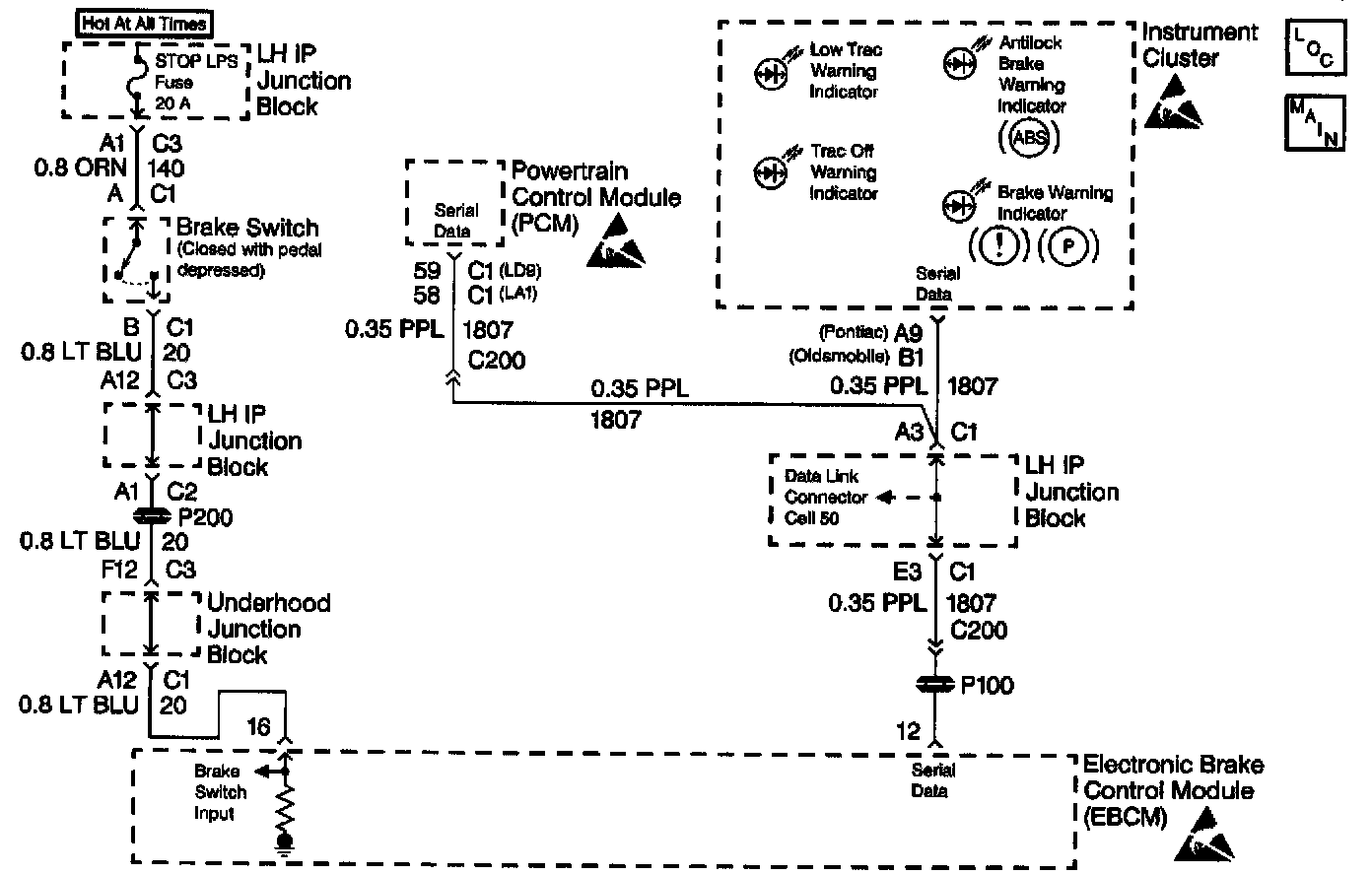 Two-way serial communication is sent back and forth between the EBCM and the IPC. A message from the IPC is sent to the EBCM within seven seconds after ABS initialization. A serial communication failure does not allow the proper warning indicator commands to be sent back to the IPC.