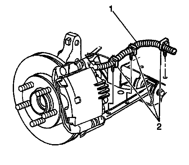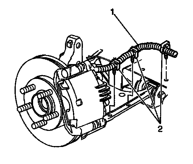 4. Install the front wheel speed sensor harness attaching clips (2) to the control arm and the frame.