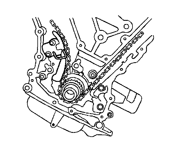 6. Remove the timing chain tensioner and timing chain. Refer to Timing Chain, Sprockets, and Tensioner Replacement.