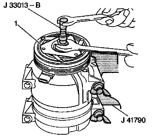 5. Remove the hub and drive plate assembly (1) by turning the center screw into the body of the hub and drive plate installer and against the compressor shaft.
