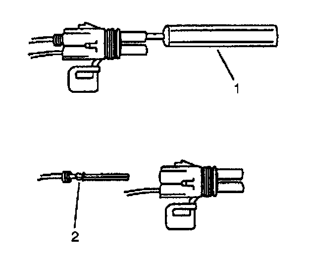 ^ Insert the Weather Pack(R) terminal removal tool into the front (mating end) of the connector cavity until it rests on the cavity shoulder (1).
