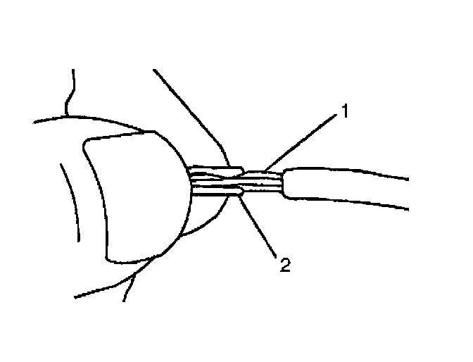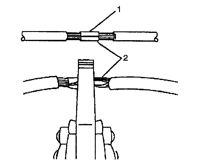 7. Center the splice clip (2) over the stripped wires (1) and hold the clip in place.