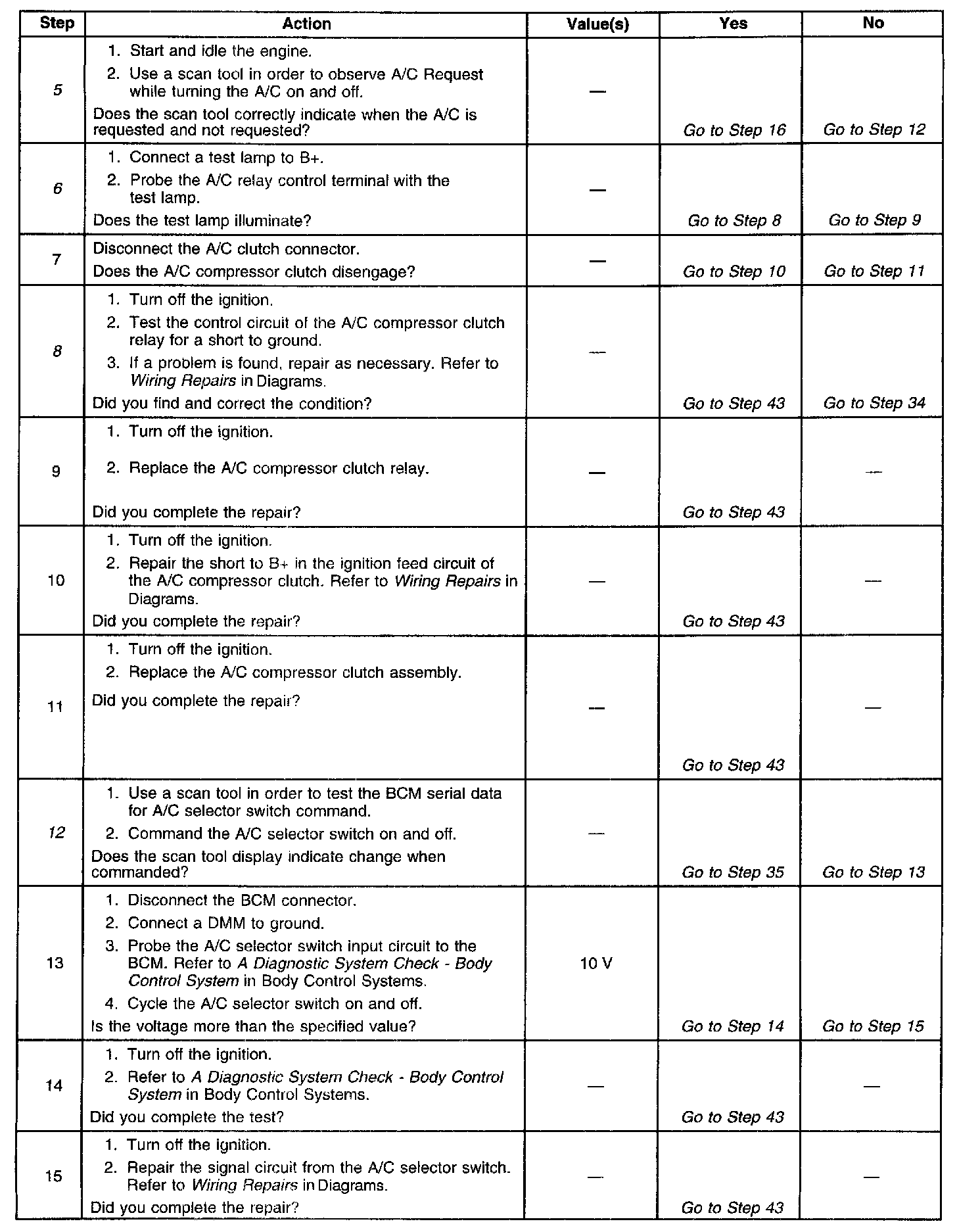 12. The A/C request signal is communicated through the BCM to the PCM over the Class 2 serial data line. The BCM also receives other information in order to decide if the A/C request should be enabled. This step tests for the A/C request switch for the correct function. Additional steps must be completed in order to perform this step correctly. The blower motor must be turned on and the heater, the vent, and the A/C control selector switch must not be in the off position. With the A/C selector switch in the off position, the scan tool should read A/C request off. If the A/C selector switch is in the on position, the scan tool may read Clutch enabled or the following conditions: Off, Low RPM - off, Low Ambient - off, High Press - off, Low Battery Voltage - off, High Coolant Temp. If any of the above conditions are present on the scan tool when the A/C selector switch is enabled, the BCM senses a change.