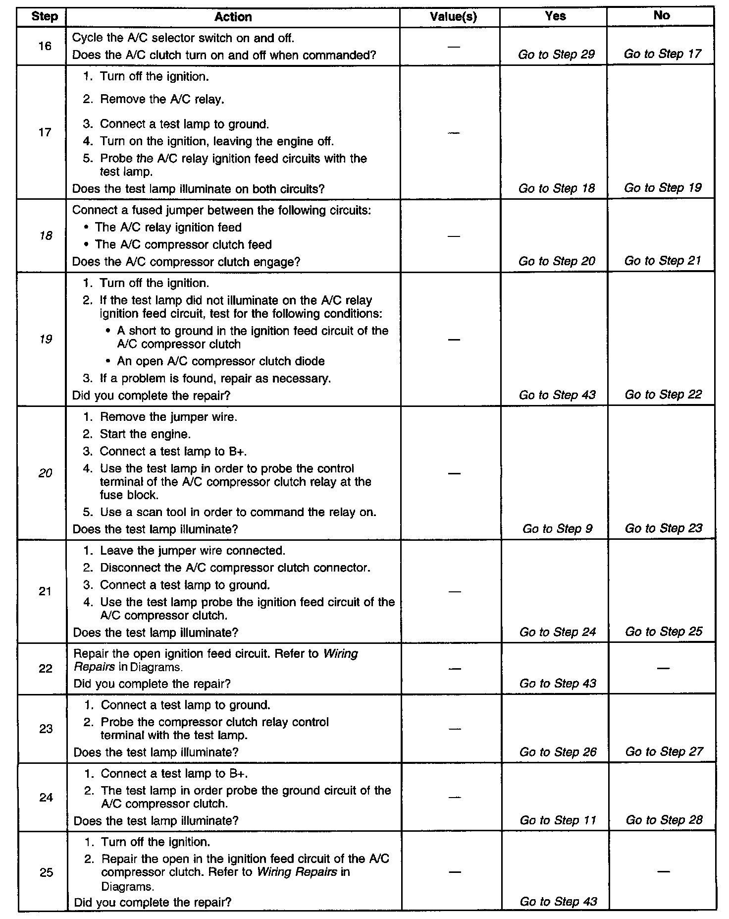 6. A test lamp that does not illuminate indicates that the A/C compressor clutch relay is malfunctioning.