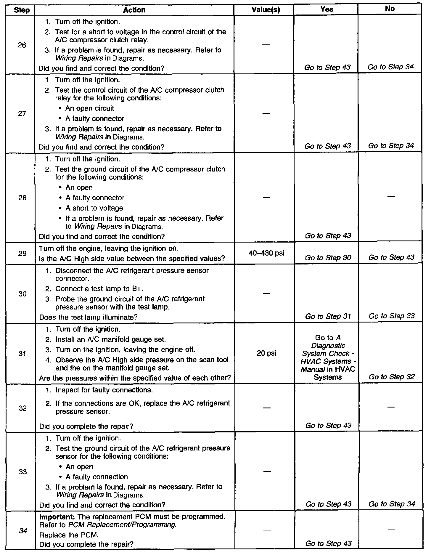 ^ An A/C refrigerant pressure outside the range of 43 to 428 psi, will cause the A/C compressor clutch to be disabled by the PCM. Observe the A/C refrigerant pressure parameter on the scan tool for 2 minutes with the engine idling and the A/C on. If pressure goes out of range, refer to A Diagnostic System Check - HVAC Systems - Manual in HVAC System. Testing and Inspection