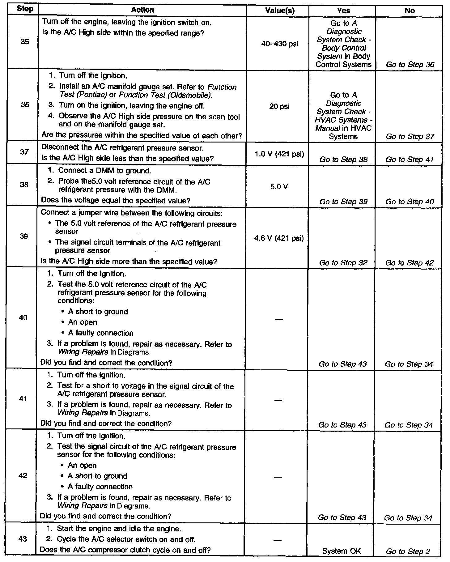 36. This step determines if the A/C refrigerant pressure sensor is out of range causing the A/C compressor clutch to be disabled or if the A/C charge is to low to allow A/C operation.