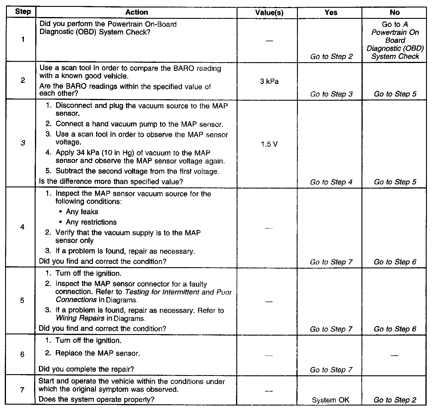 3. Applying 34 kPa (10 in Hg) vacuum to the MAP sensor should cause the voltage to be 1.5 to 2.1 volts less than the voltage at Step 3. Upon applying vacuum to the sensor, the change in the voltage should be instantaneous. A slow voltage change indicates a malfunctioning sensor.