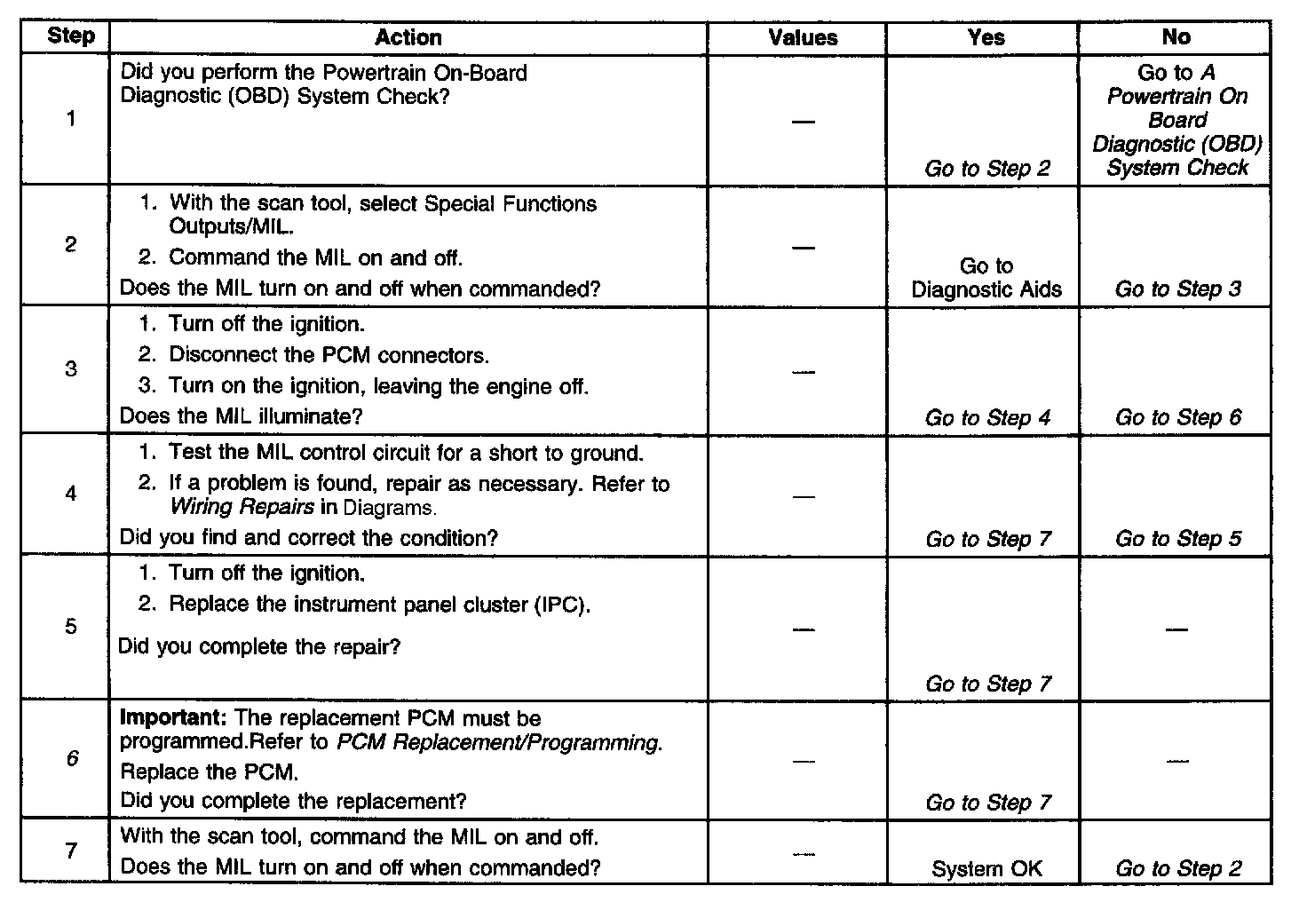 The number below refers to the step number on the diagnostic table.
