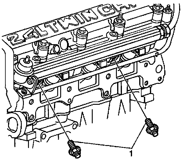11. Remove the fuel rail attaching bolts (1).