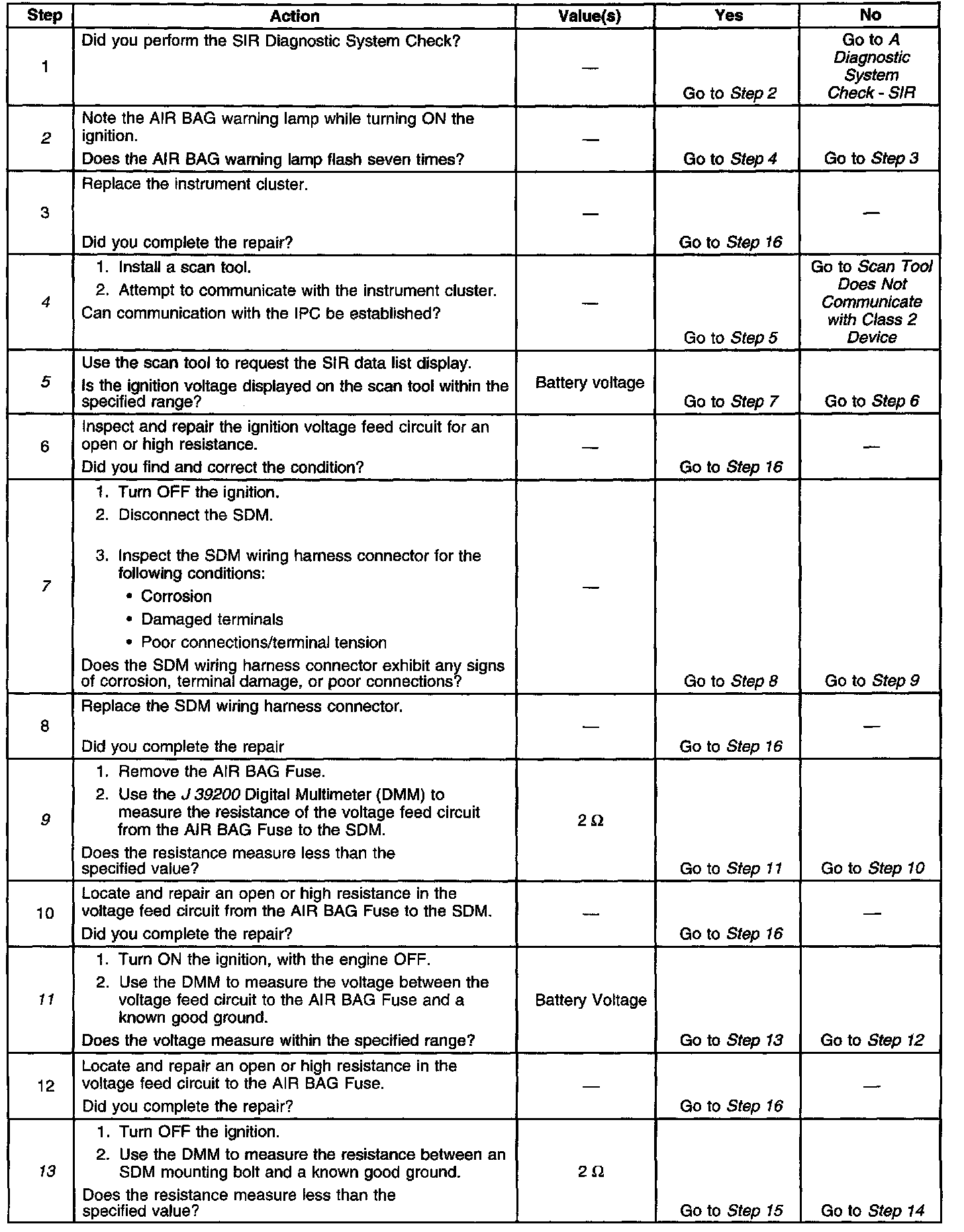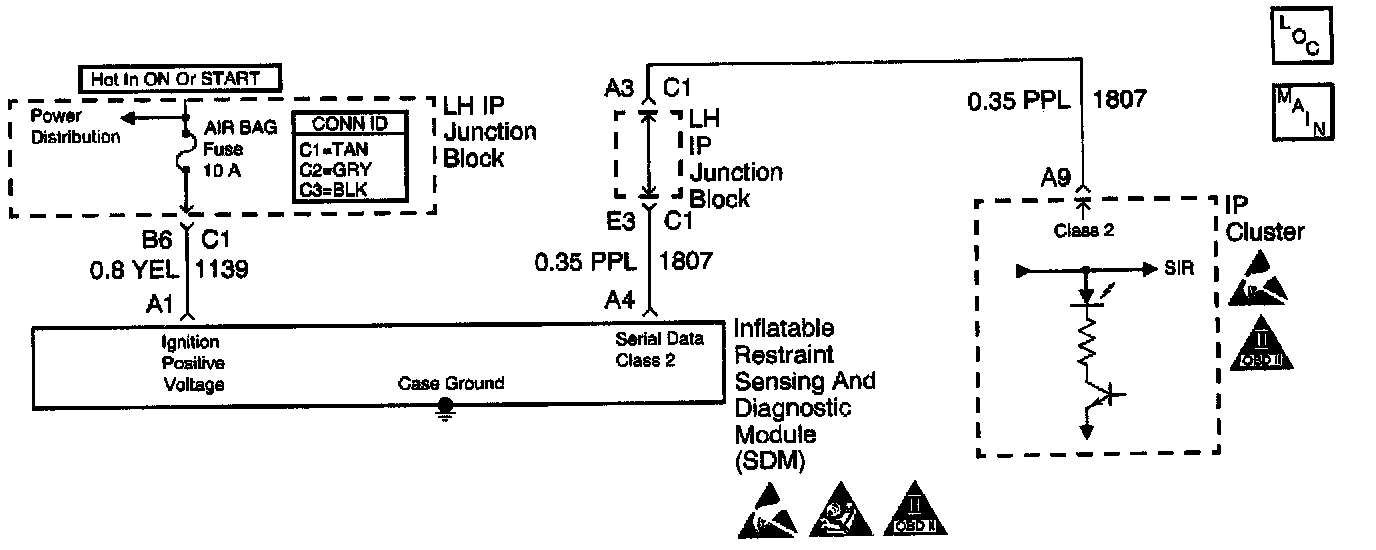 The ignition switch supplies ignition voltage to the inflatable restraint Sensing And Diagnostic Module (SDM) at terminal A1 using the AIR BAG Fuse. The ignition switch also supplies ignition voltage to the instrument cluster. The AIR BAG warning lamp is controlled by the SDM via Class 2 serial data. When the ignition switch is first turned ON, the instrument cluster flashes the AIR BAG warning lamp seven times. During this time the SDM performs tests on the SIR system then commands the instrument cluster to turn OFF the AIR BAG warning lamp after it has flashed seven times. If the ignition voltage is outside of the normal operating voltage range (9-16 V), the SDM will command the instrument cluster to turn ON the AIR BAG warning lamp with no DTCs present.