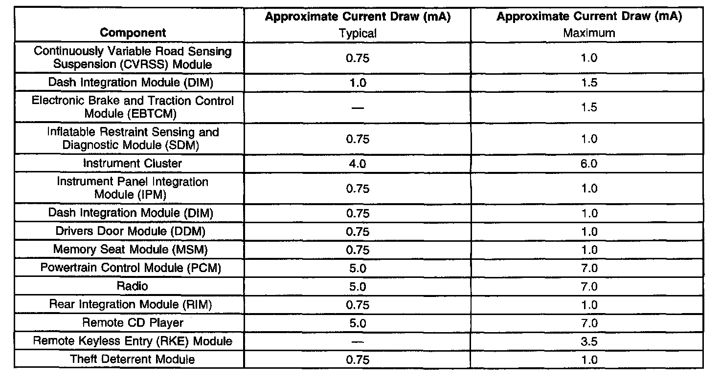 19. When the vehicle has an unacceptable amount of parasitic current drain, remove each fuse one at a time until the current drain falls to an acceptable level. This will indicate which circuit is causing the drain. Refer to Power Distribution Schematics in Diagrams to diagnose exactly which part of the suspect circuit is causing the parasitic drain. In some cases a non-fused circuit or component, such as a generator, is the cause of excessive parasitic current drain. Refer to the Battery Electrical Drain/Parasitic Load Test Table.