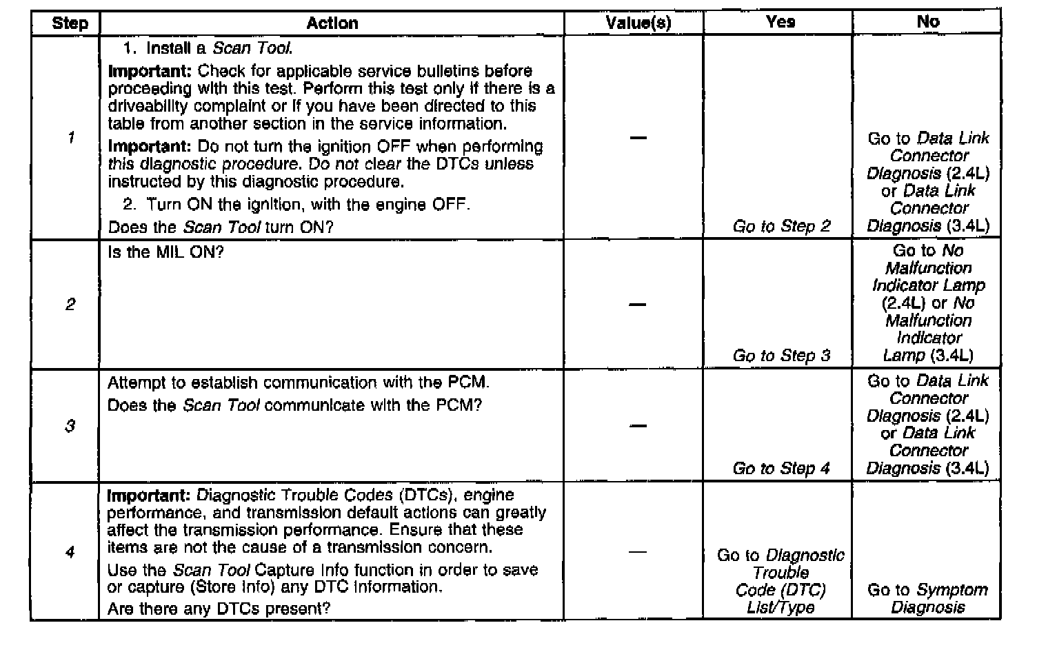 The Automatic Transmission Diagnostic System Check is an organized approach to identify a problem created by an automatic transmission. The Diagnostic System check is the diagnostic starting point for an automatic transmission complaint. The Diagnostic System Check directs you to the next logical step for diagnosing a transmission concern. Perform this check only if there is a driveability complaint or if you have been directed here from another service information section.