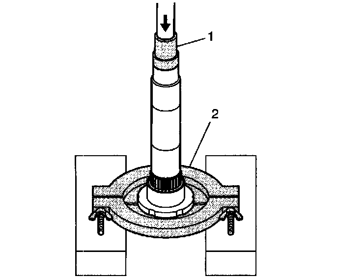 6. Remove the collar and the thrust washer using the J 44378 (1) J 36513 (2), and a hydraulic press.