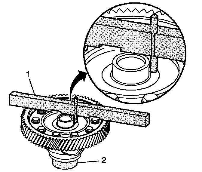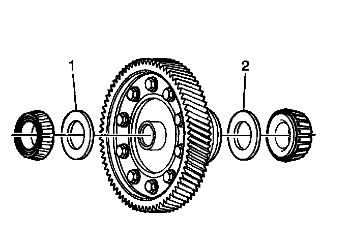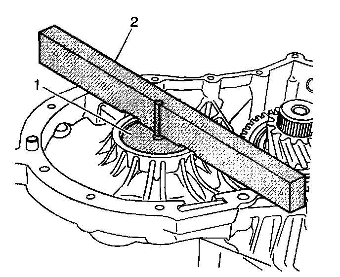 9. Make sure the left differential bearing race is fully seated into the transaxle case using the J 7079-2 (1) and the J 44385 (2).