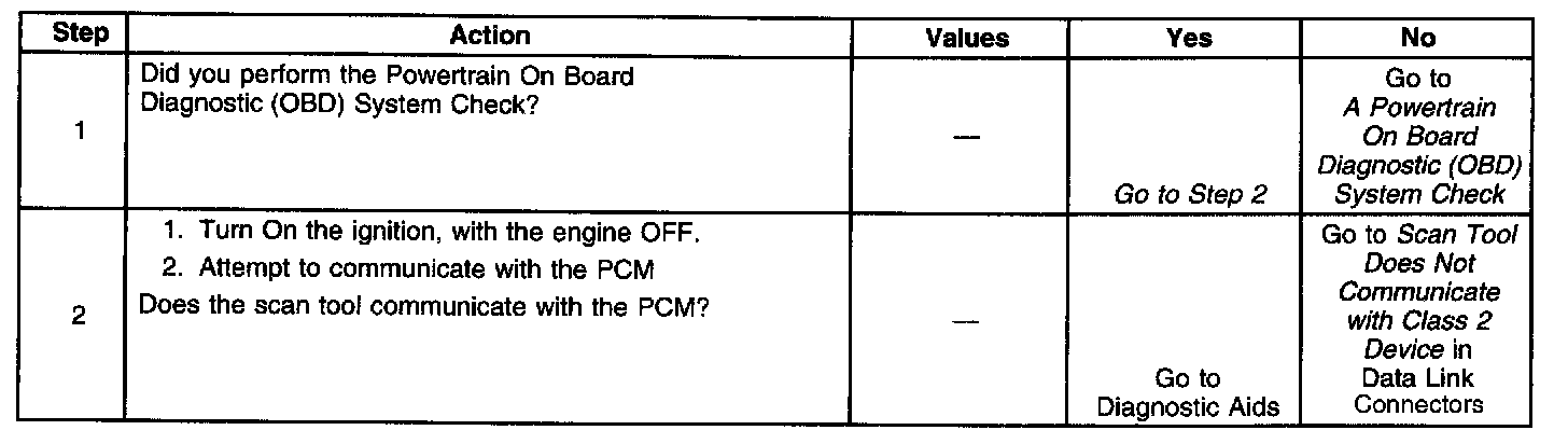 The Class 2 serial data circuit to the DLC allows bi-directional communication between the PCM and the scan tool. If communication between the scan tool and the PCM cannot be established, the procedure in the DLC Diagnosis table should be used to diagnose the condition.